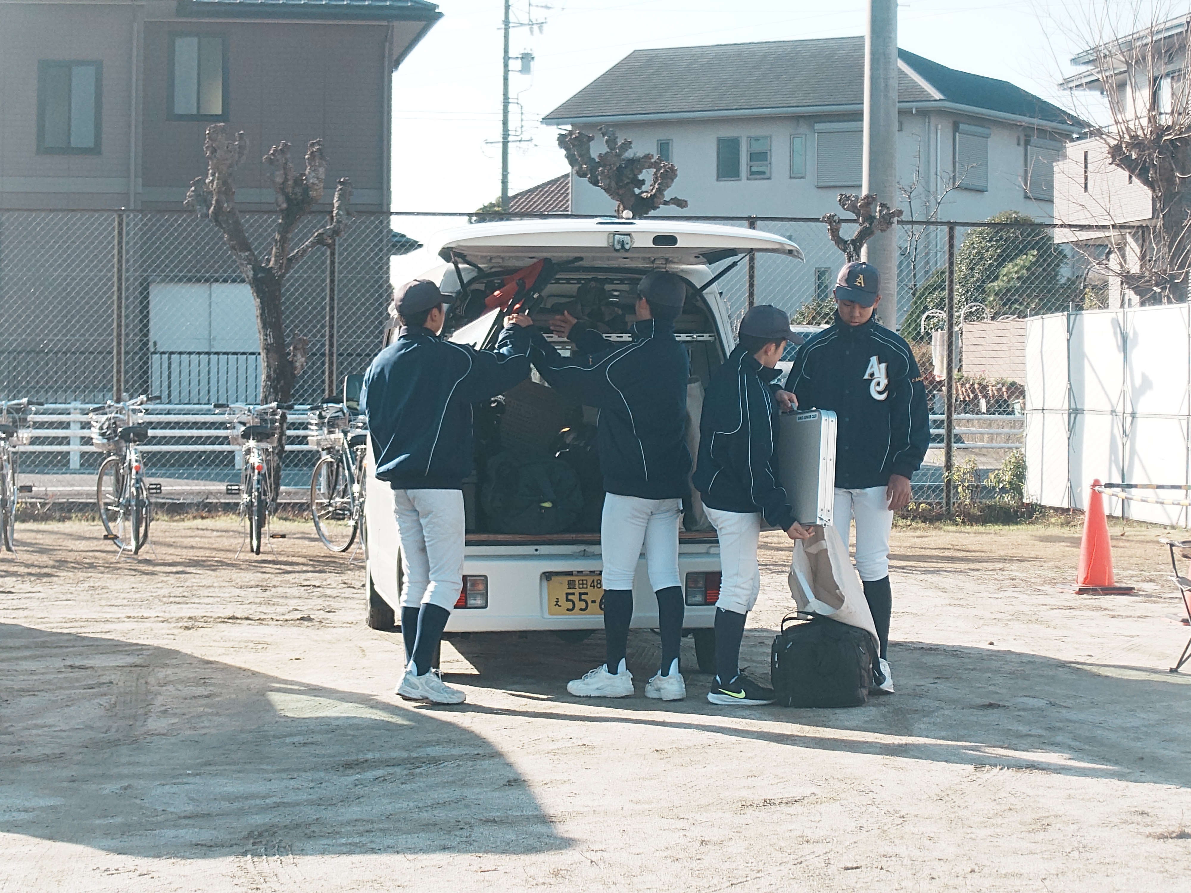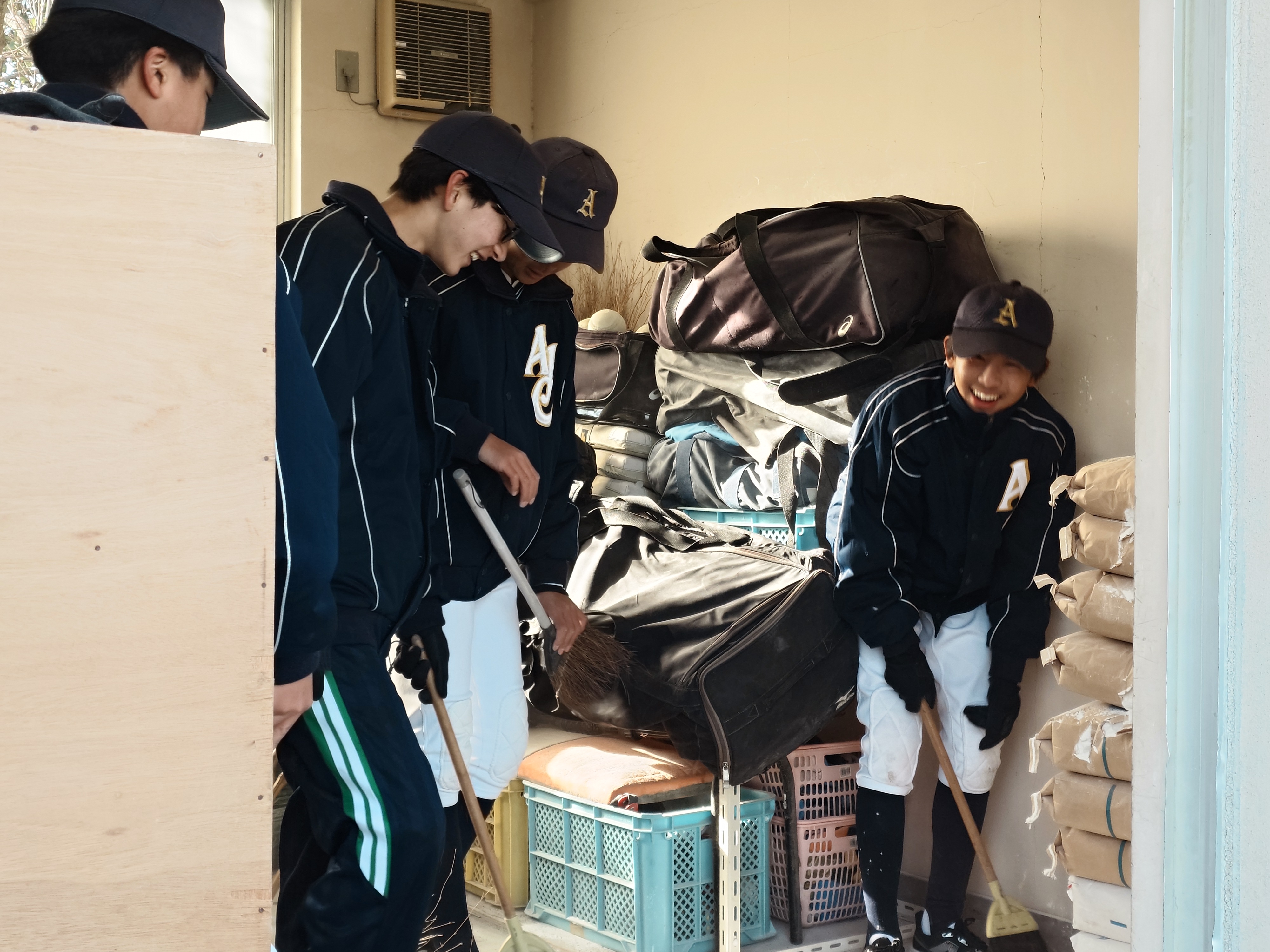 2. 感謝を込めて大掃除 マラソンで体力を使い果たした後は、1年間お世話になった道具や場所への感謝を込めて「大掃除」です。 AJCカー(チーム車)や倉庫からすべての練習道具を外に出し、徹底的に整理整頓。最後は東山中学校のグランド整備を行い、今年の活動をすべて終了しました。