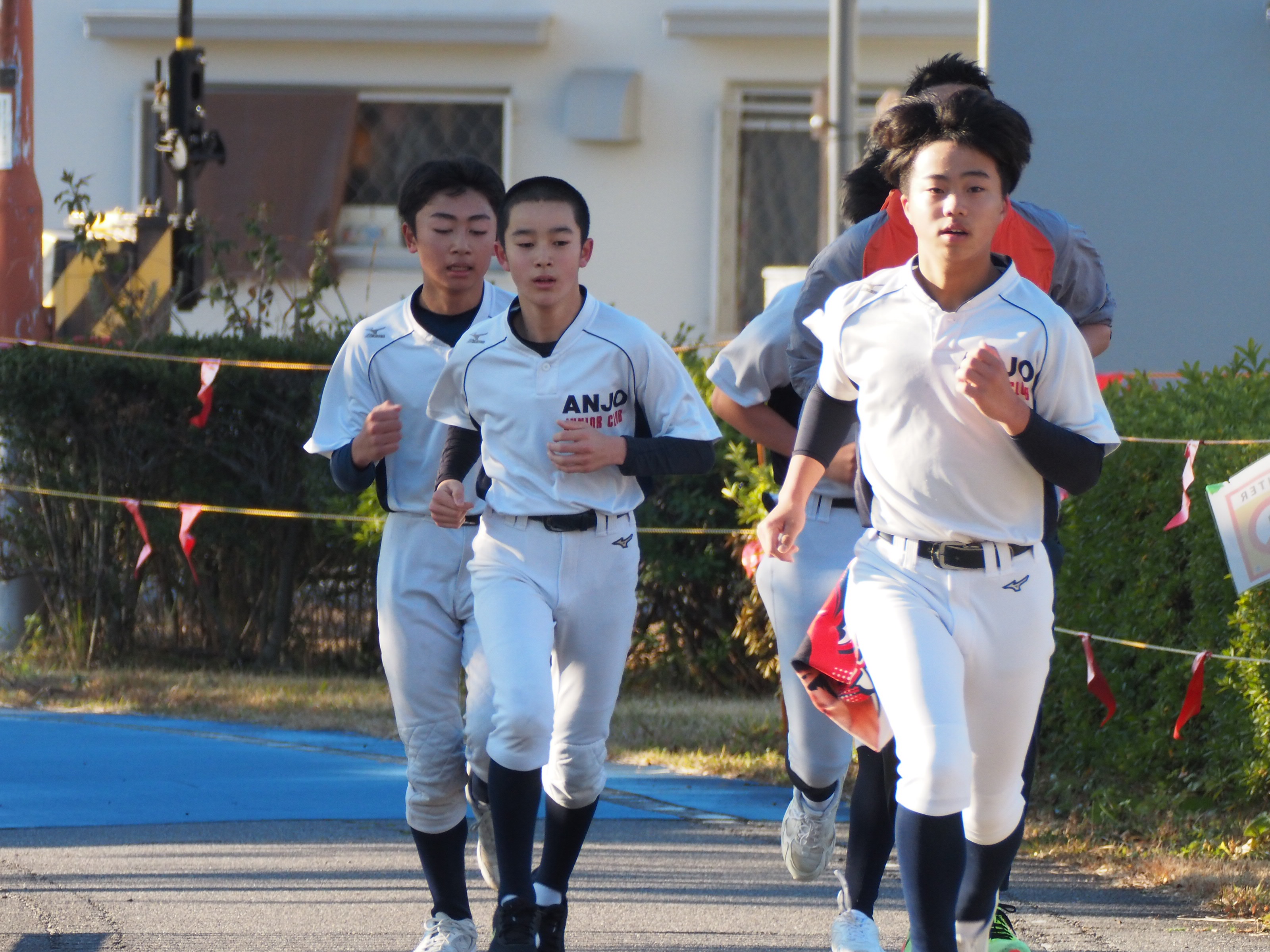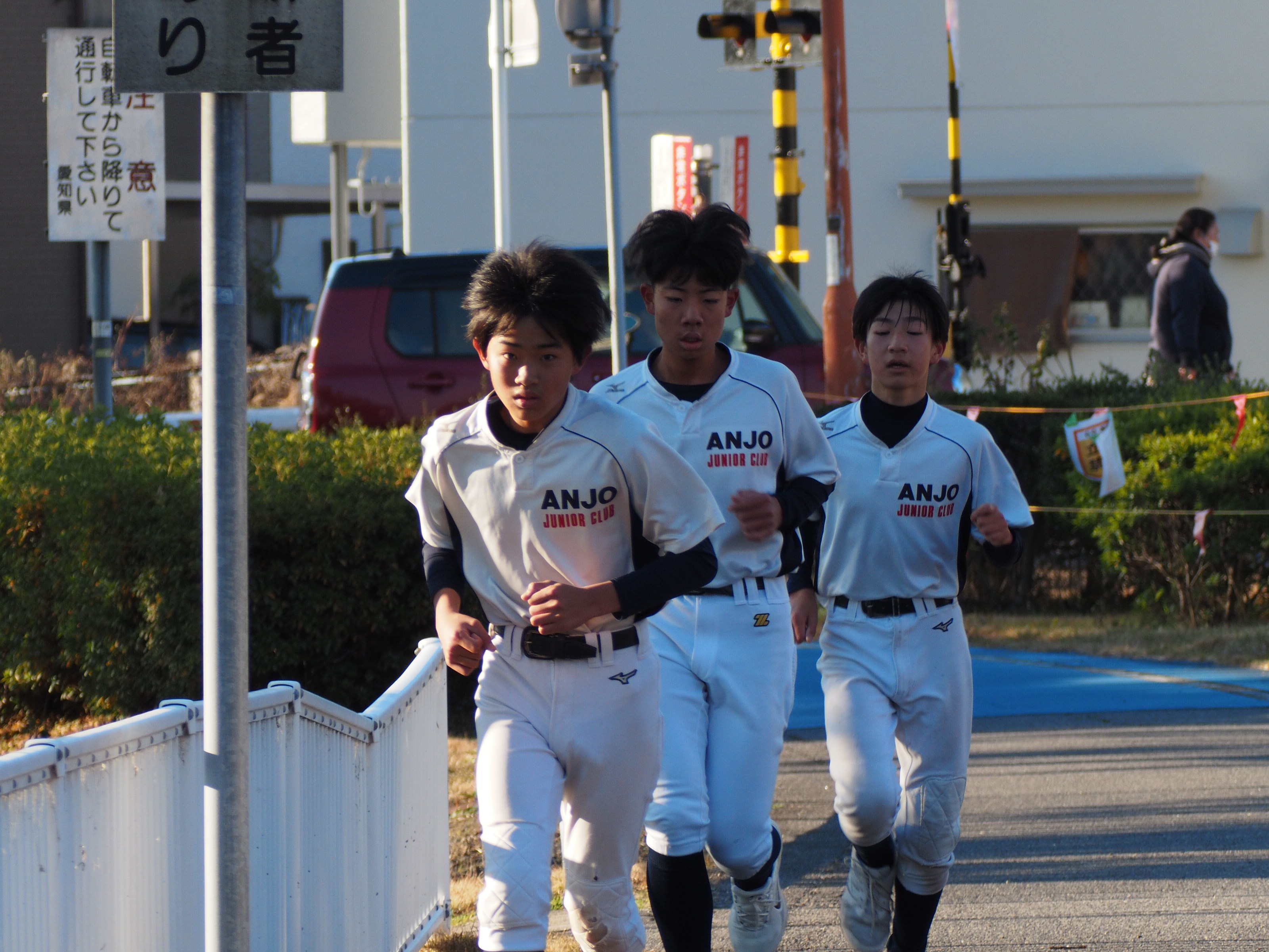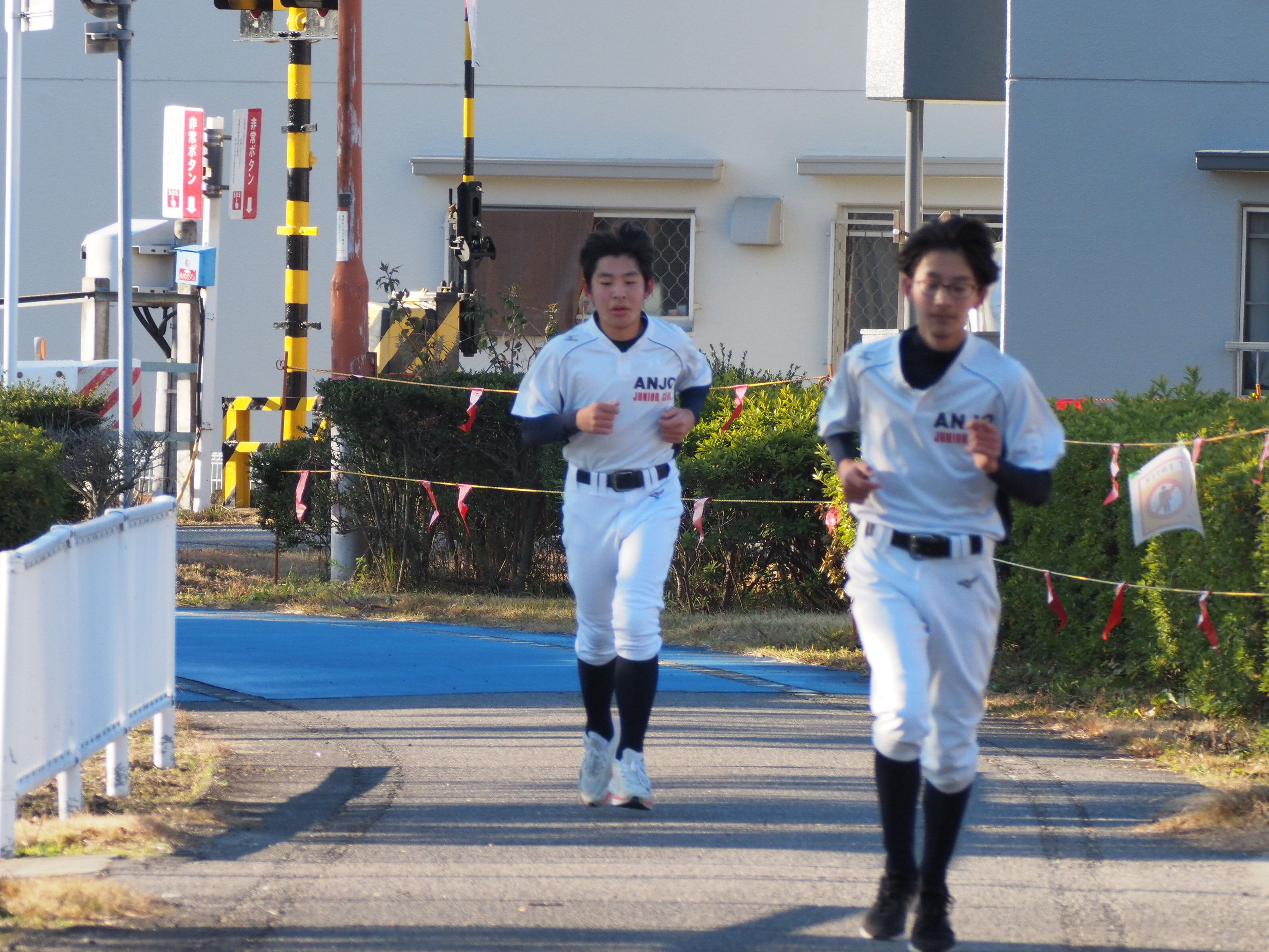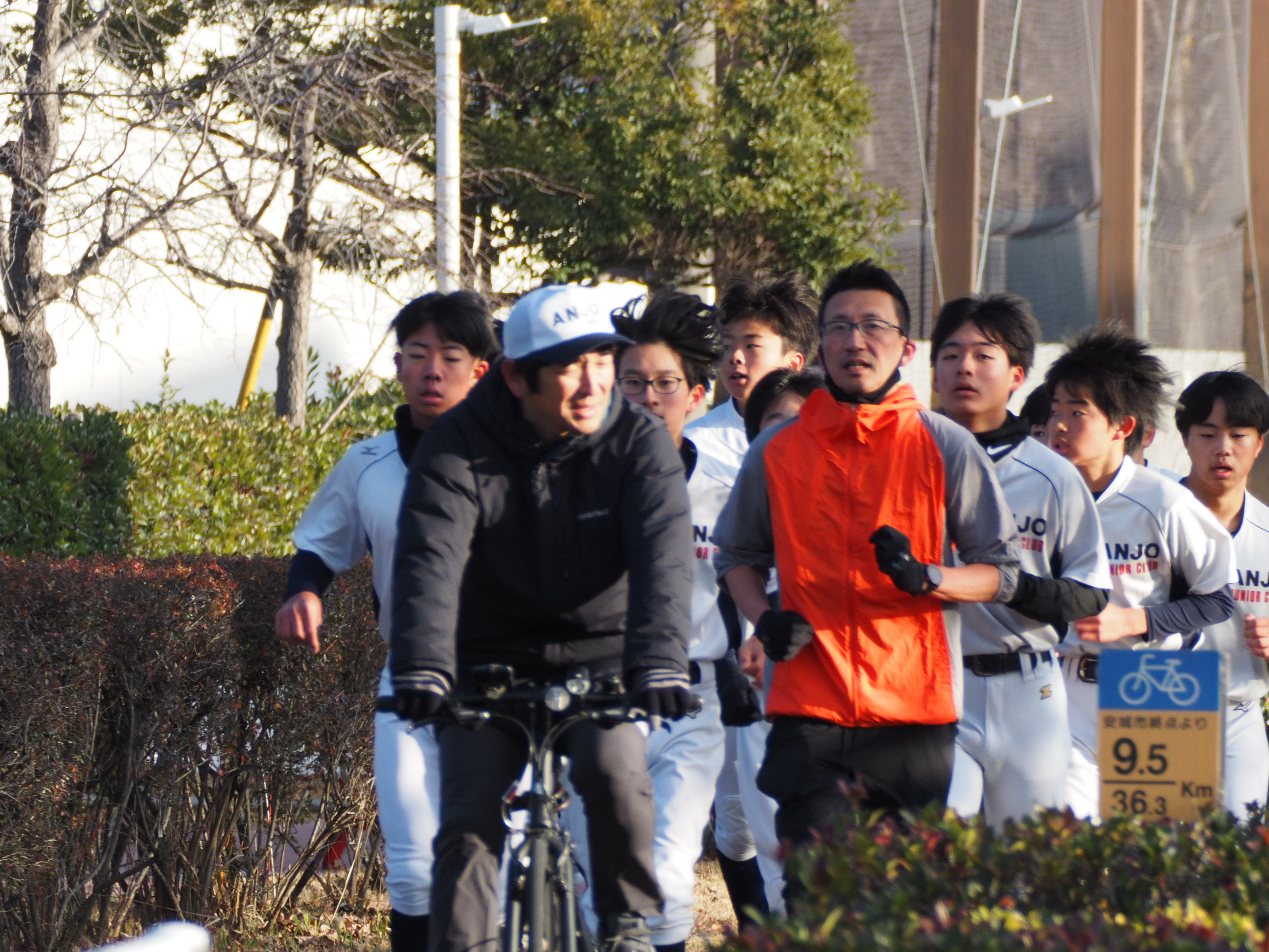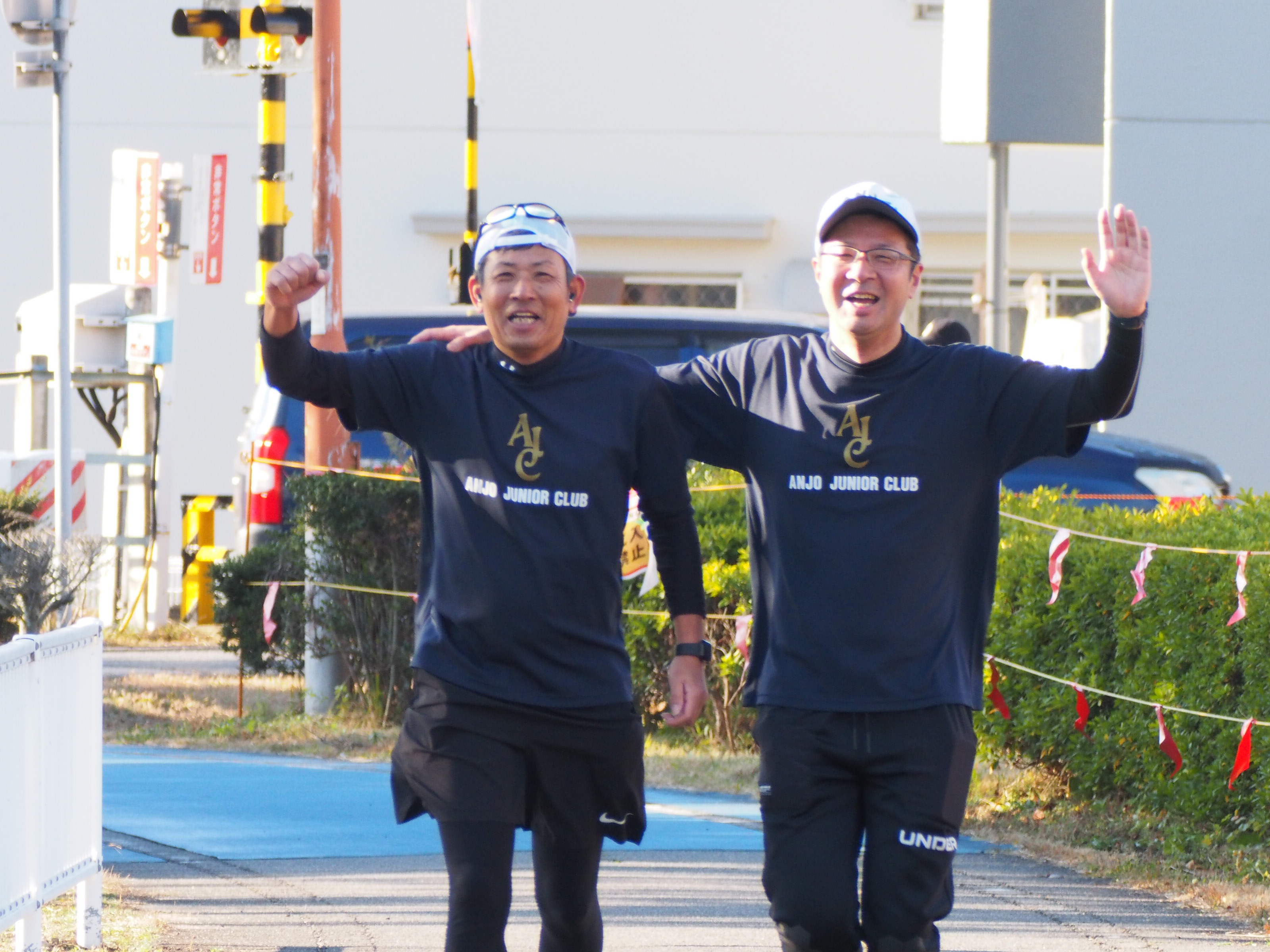 1. 激走!年末10kmマラソン 本日12月27日、安城ジュニアクラブの2025年を締めくくる、毎年恒例の「年末10kmマラソン」が行われました。朝8時のスタート時点での気温は3℃。身を切るような寒さでしたが、空を見上げれば透き通るような青空が広がっていました。まさに絶好のマラソン日和です。コースは東山中学校から安城市役所までの往復10km。白い息を吐きながら一斉にスタートした選手たち。 今回は、選手だけでなく保護者の方々も一緒に走って参加し、隣で力強く鼓舞してくださいました。また、最後尾で苦しむ選手には、コーチや保護者が自転車で寄り添い、ゴールまで温かい声を掛け続ける姿も見られました。苦しい場面もあったかと思いますが、仲間同士の励まし合い、そして保護者・コーチの温かい支えを受け、自分自身と戦抜いた結果、なんと参加した選手全員が無事に完走することができました!