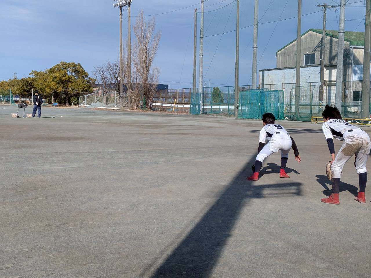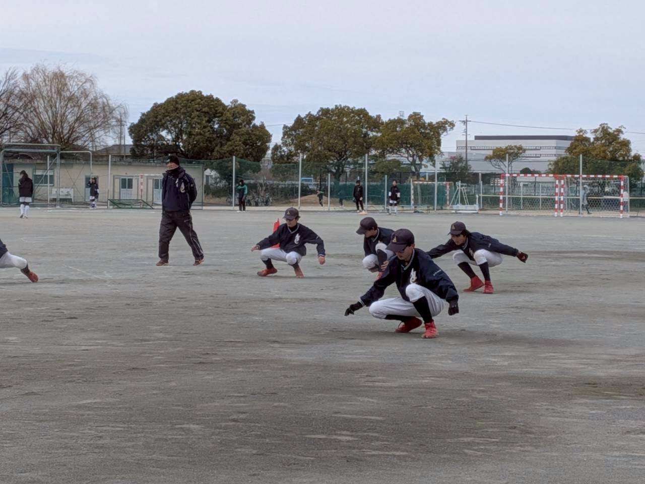 練習途中からは日差しも差し込み、動いている選手たちの額には汗が滲むほどでした。 特に重点的に行われたのが「アヒル歩き」などの股関節周りのトレーニング。地味でキツイ動作ですが、怪我の防止や守備時の低い姿勢を作るためには欠かせない要素です。選手たちは互いに声を掛け合い、自分たちで雰囲気を盛り上げながら、一本一本集中して取り組んでいました。