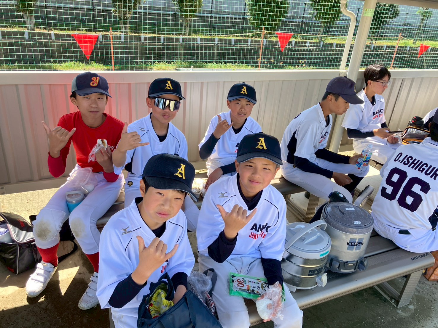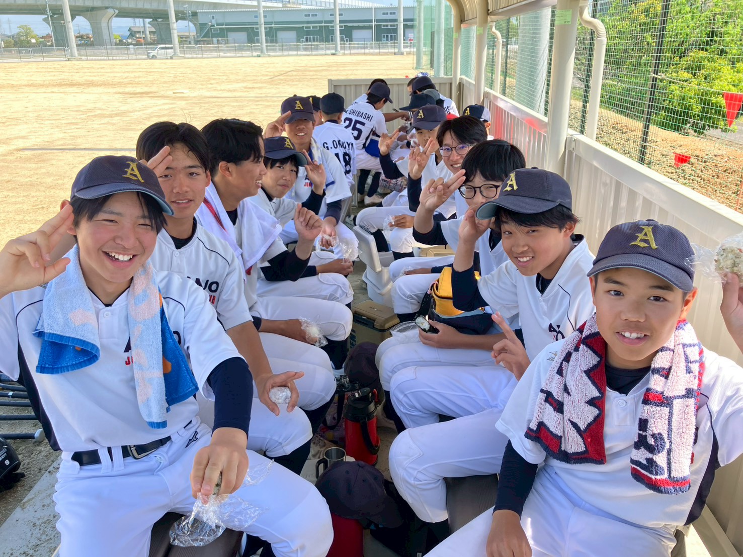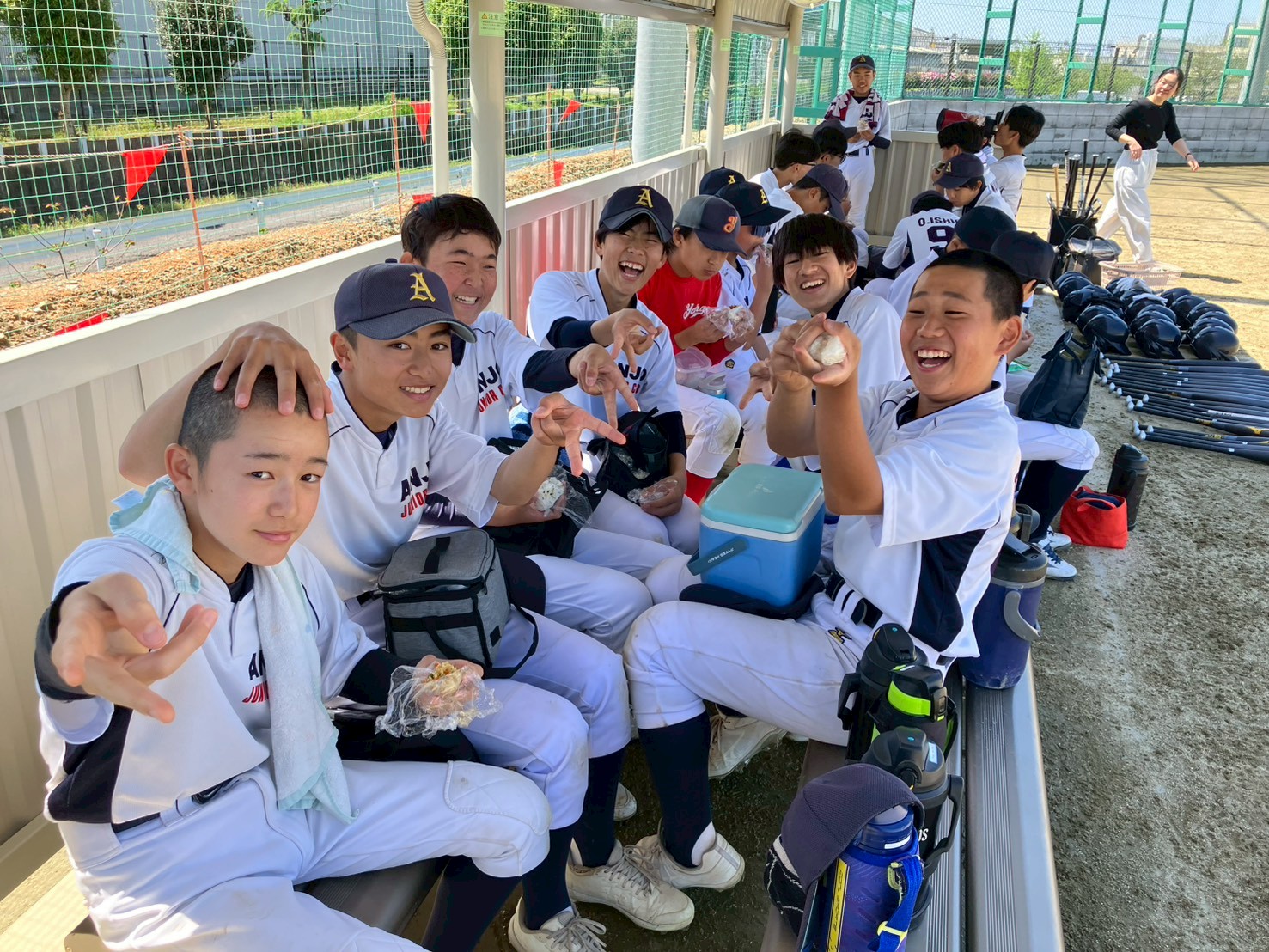 3年生・2年生: さすがの貫禄(!?)というか、カメラを向ければこの笑顔!森さん(当番)の絶妙な声掛けのおかげで、おにぎりを片手に最高の表情を見せてくれました。チームの絆の深さが伝わります。
